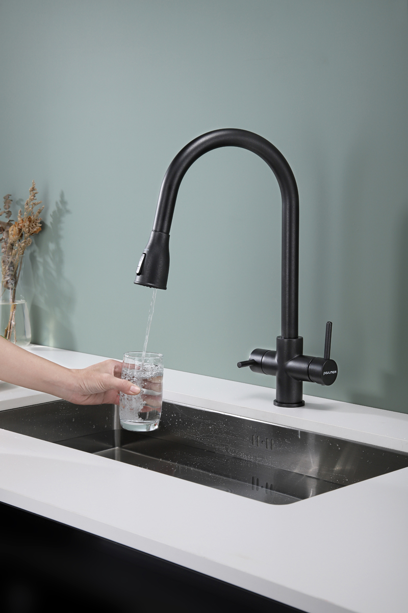 Смеситель LANGE оснащен функциями подключения фильтра питьевой воды, выдвижения излива и двумя режимами подачи водопроводной воды: струя и душ.